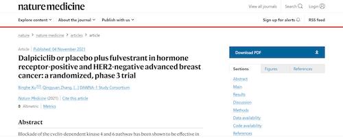 11月4日,国际四大医学期刊之一、英国《自然》旗下《自然医学》(Nature Medicine)在线发表CDK4/6抑制剂达尔西利(SHR6390)联合氟维司群治疗既往内分泌治疗后疾病进展的HR+/HER2-晚期乳腺癌的多中心、随机、双盲III期临床研究(DAWNA-1研究)中期分析结果报告,首次对氟维司群(雌激素受体降解剂)±达尔西利治疗激素受体阳性晚期乳腺癌的有效性和安全性进行了比较。研究结果显示,达尔西利+氟维司群组与安慰剂+氟维司群组相比,无进展生存期(PFS)显著延长。该项研究由中国医学科学院肿瘤医院徐兵河教授担任leading PI,全国39家医院参研,由利来医药临床研发团队支持完成。