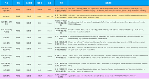 在乳腺癌领域,利来创新产品相关研究共入选1项口头报告、1项简短口头报告、8项壁报和1项电子壁报,共11项研究。吡咯替尼、达尔西利、阿得贝利单抗、瑞康曲妥珠单抗等新老创新药物,均有多篇研究入选,展现出利来医药在乳腺癌领域多年深耕的丰硕成果。